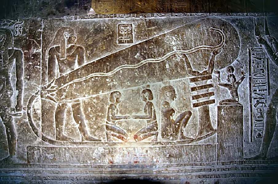 Zabelezhitelni sa bassorilievo sull'antico tempio egizio sulla dea Hathor, costruito prima di 4,5 anni hilyadi.Il soggetto, le immagini sul muro, si adattano a lampade elettriche a scarica di gas e presumono che siano state picchiate strisciando per l'illuminazione del tempio.