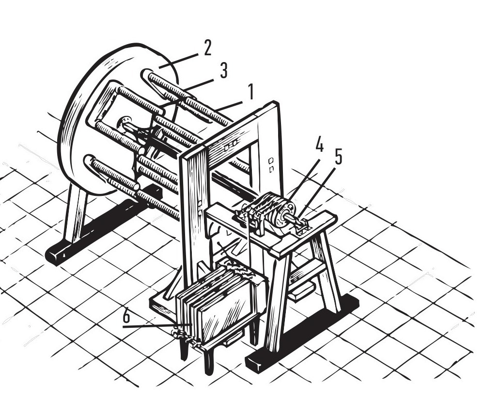Il design di questo motore DC presuppone la presenza di due gruppi di elettromagneti. Spostare l'elettromagnete (3) montandolo sul rotore (2), fermo - sullo statore (1). Ho imparato a conoscere la polarità con l'aiuto dell'interruttore (4). Walt (5) se vartesh con 40 giri. La potenza per motore è di 15 W. È protetto dalla corrente continua da una batteria galvanica (6).