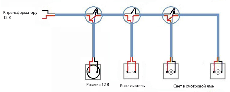 Lasciando tutto il diagramma di disegno sulla memoria dietro la lampada sulla fossa di revisione e sul contatto 12 V, dove collegheremo anche il naso e gli utensili elettrici a bassa tensione.
