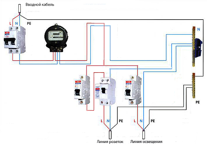 La tensione dalla strada è l'ingresso all'ingresso della macchina 1 se alimenta il contatore elettrico e da esso lo distribuisce lungo quattro linee: