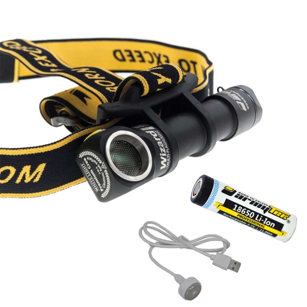 L'alimentazione può essere immagazzinata utilizzando una singola batteria 18650 o 2 batterie CR123A (quando si utilizza una batteria CR123A, la ricarica USB non è possibile). Il tempo di funzionamento massimo per una singola carica è di 100 ore con una modalità operativa minima. Può essere scaricato con l'aiuto di un cavo USB.