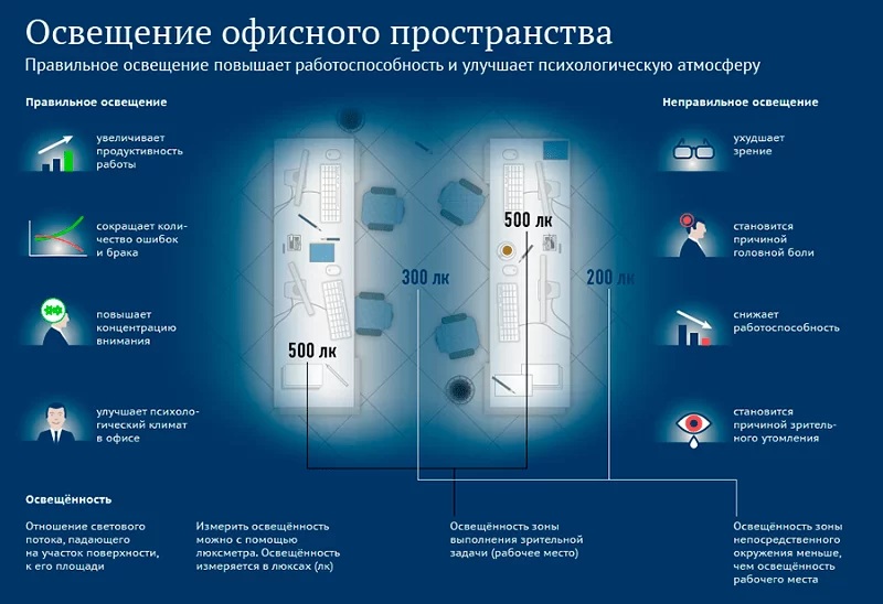 Ima causa molto per spazvane sullo standard per l'illuminazione dell'area di lavoro. Parvo, tova se isskva from razporedbite sullo standard per la protezione sul lavoro. Tuttavia, il manager ha accettato di ripulire l'illuminazione per il posto di lavoro, per evitare il mondo o il disordine. In secondo luogo, con un'illuminazione insufficiente, la qualità del lavoro diminuisce drasticamente. E la cosa più importante: se è ben organizzato, il chiarimento di per sé non è salutare, ma ha anche un effetto positivo sul vertice dell'acuità visiva e sulla miseria del ministro.