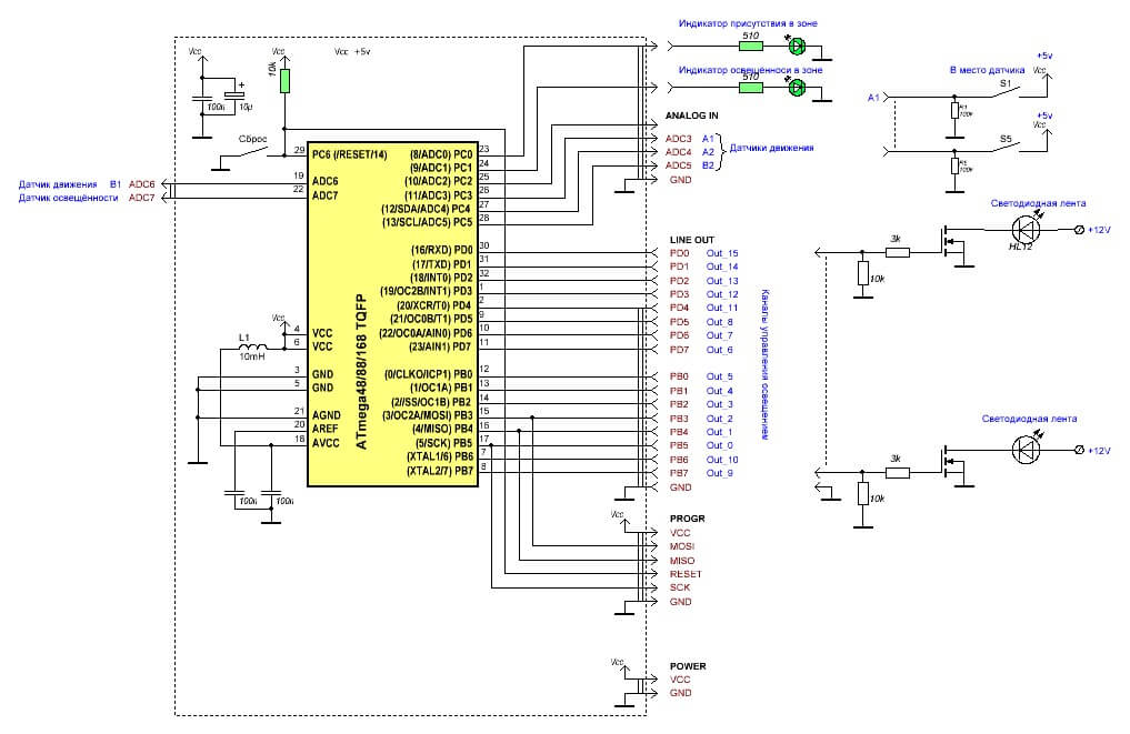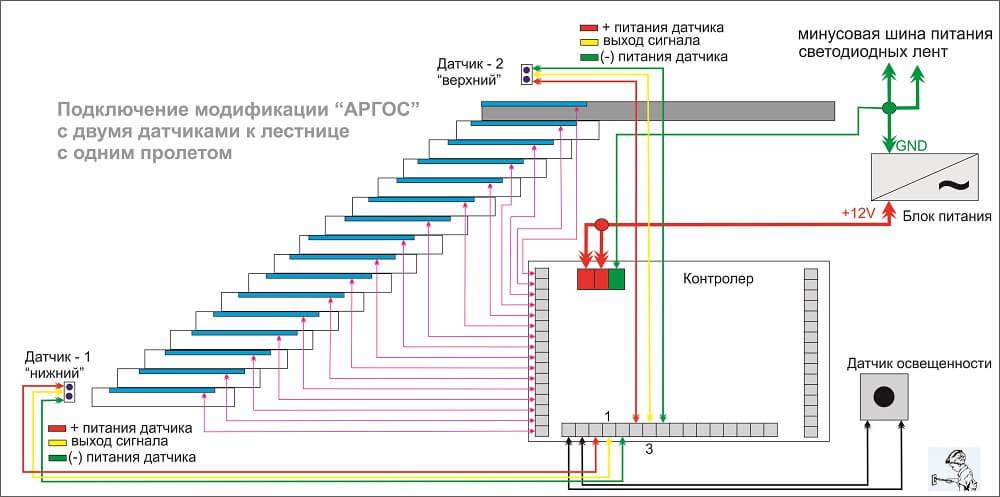 Gli elementi di base nel bacino sono il circuito del controller, il quale controller è alimentato da una sorgente LED. Il compito di e e un garante è piuttosto piccolo, che il sistema del se starter abbia una traccia del segnale ricevuto dal sensore, che accende gradualmente il nastro sotto lo steppalat.