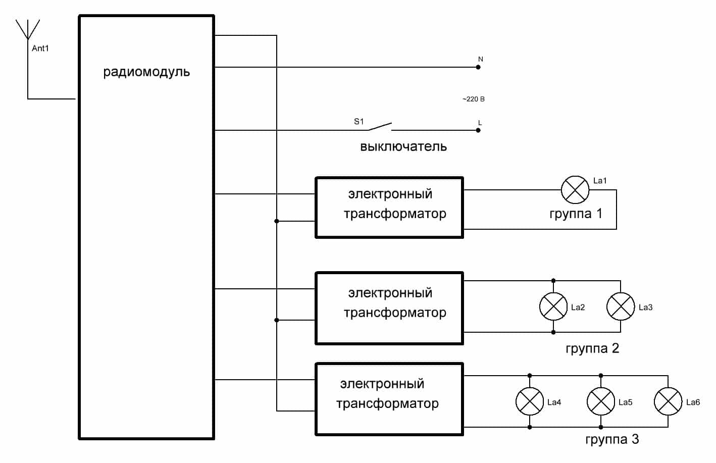 Razbrahme design, saltiamo alcune catene elettriche. Pensa all'opzione no-scusa, se usi lampade da 220 V, dividi in tre gruppi. Questo dispositivo di controllo remoto si basa sul modulo radio Feron a tre canali, l'immagine su alcuni è presentata di seguito.