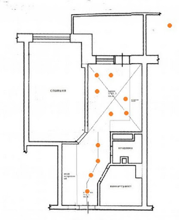 Quando scegli uno schema per l'illuminazione sotto i riflettori, prendi una previsione della distanza tra la fonte di luce e la distanza dai mobili principali. Il gradino abituale sui punti LED installati sulla tavana della cucina è di 40 cm, nella zona di testa la distanza dalla parete seduta alla sorgente del trebva e anche un po' è di 20 cm. mq per tavana.