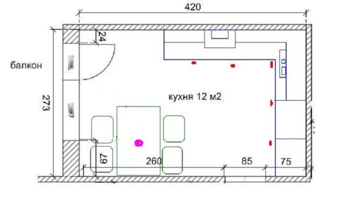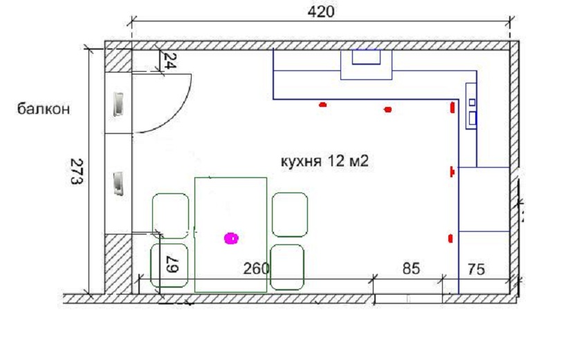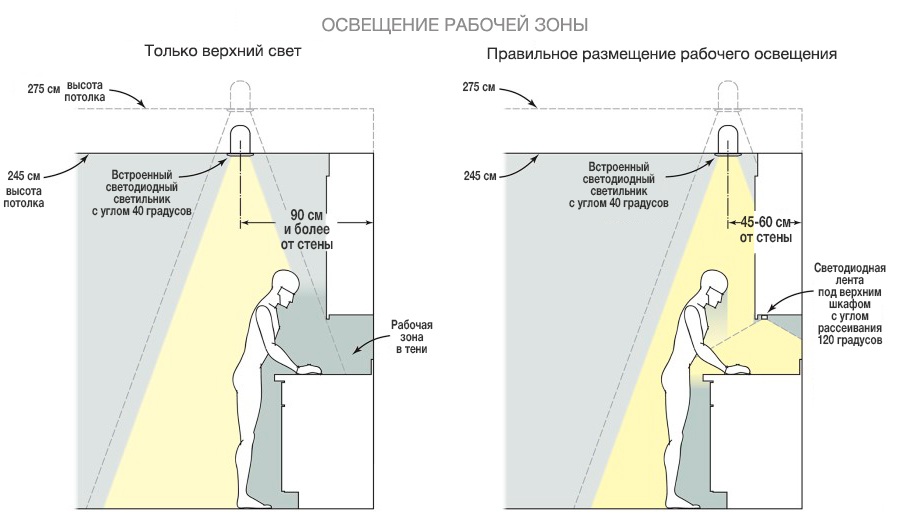 La condizione principale: sopra il lavoro sulla superficie della zattera, l'illuminazione della zattera e la luce del giorno - un piccolo 300 Lx. Non è consentito dipingere sull'illuminazione nell'area di lavoro, ma in cucina c'è abbastanza luce diurna.