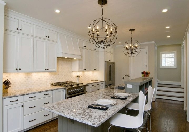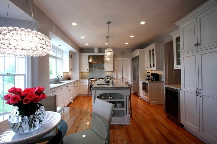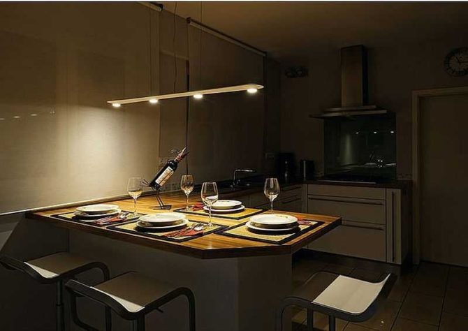 Vednaga dopo l'installazione dei proiettori necessari, treabva e pensa di metterlo sul corpo illuminante, che prenderai prevedendo il design della cucina e l'illuminazione naturale.