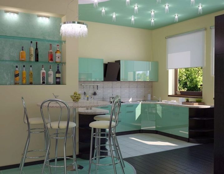 L'interno della cucina liberty del vino non è allestito con mobili e altri elementi - un armadio e una stanza fatta in casa per schermare in modo pulito il flusso di luce da un faretto su una tavana. Si prega di fornire chiarimenti in cucina 9-16 mq. può essere irregolare, con accenti luminosi e zona marina. Una lampada standard con un interruttore pressurizzato 75-100 W non ha bisogno di essere alleggerita, ma viene utilizzata sulla potenza del dispositivo, di norma, conduce verso l'alto sulle parti in plastica della lampada.