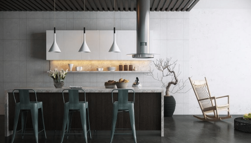 La dimensione della cucina è diversa e puoi scegliere una lampada a sospensione in base ai tuoi parametri. Credito per il design:
