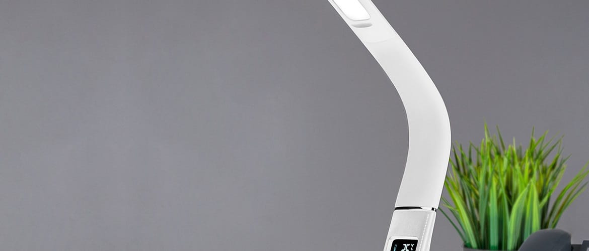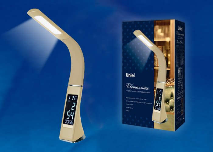 Lampada da tavolo Uniel LED con orologio, calendario e termometro è ideale per l'ufficio. Il modello è offerto in 3 colori: beige, kafyav e nero.