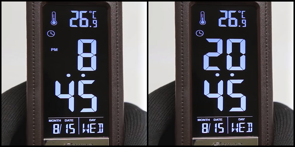 Per sì, seleziona il formato per l'ora, premi il pulsante "alto" nella modalità orologio e seleziona il formato 12 o 24 ore per l'ora.
