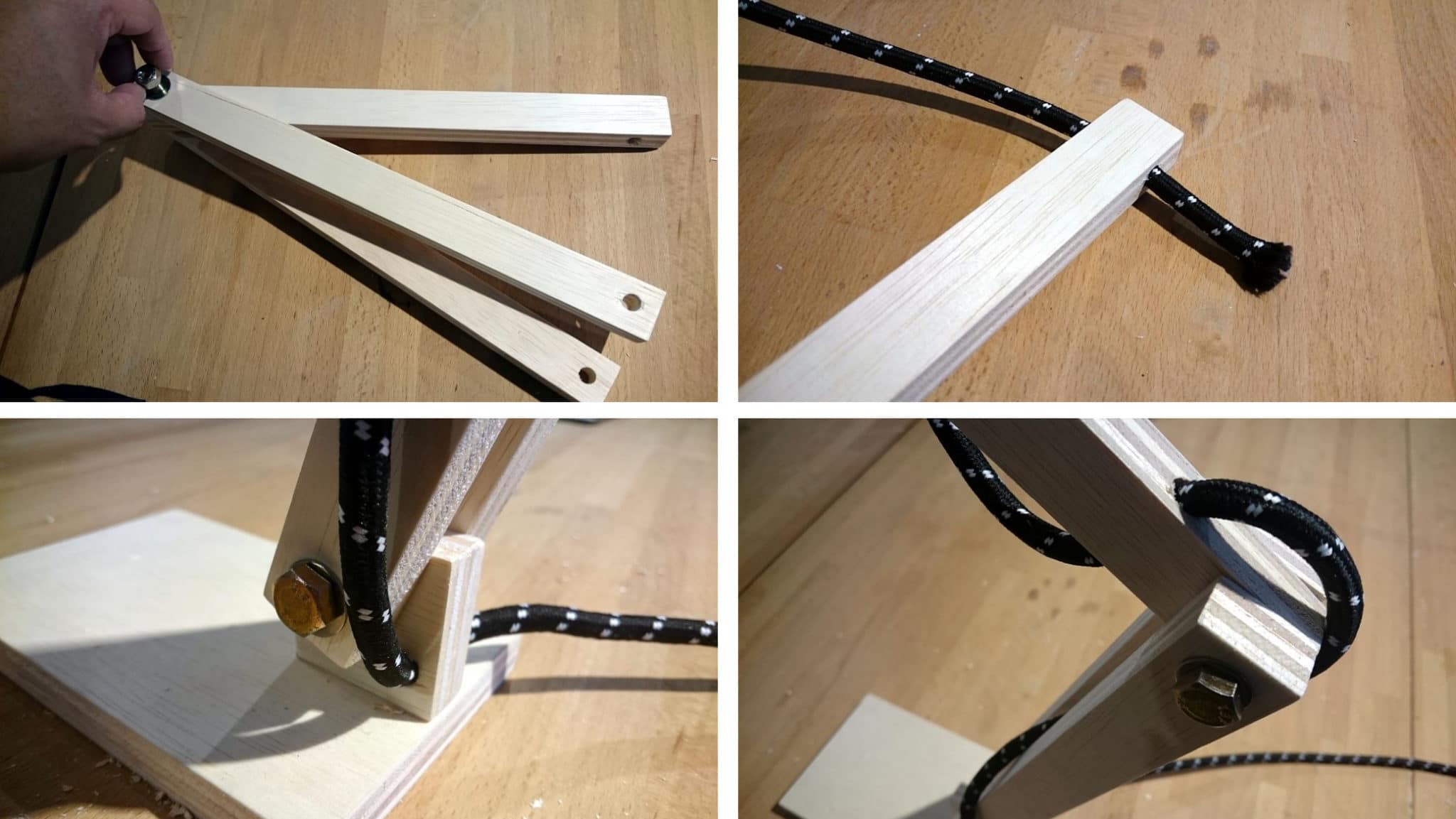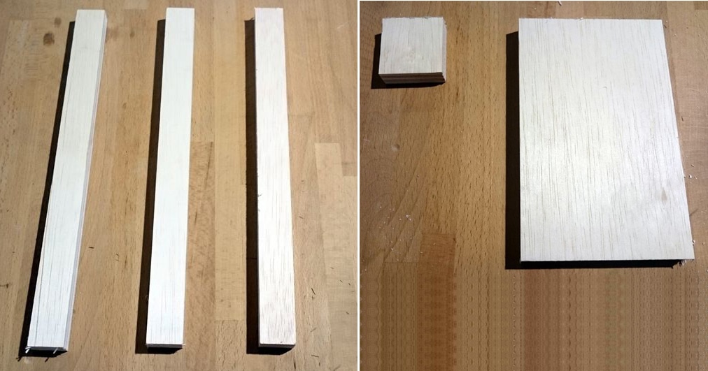Parti di animali domestici Izryazakhma da un foglio di shperplat: tre 300 × 25 mm (due ginocchia), una 160 × 100 mm (base) e 40 × 40 mm (pantalone principale).