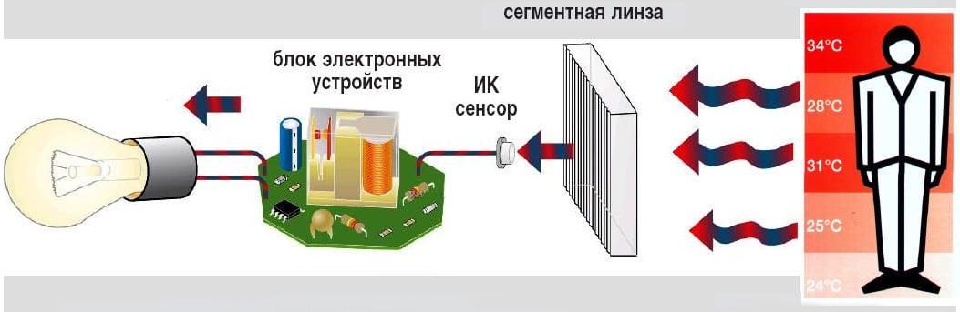 Il sensore di movimento è un dispositivo in grado di rilevare una persona e dare opportuni comandi ad un attuatore, che nel nostro caso è un lampione. I sensori sul sensore possono e funzionano su diversi principi: posizione radio o sonora, variazione di capacità o induttanza per un circuito di tracciamento, variazione di radiazione infrarossa (IR).