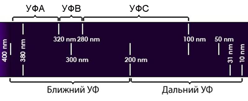 Figurata mostra chiaramente perché la gamma UV è suddivisa condizionatamente in due sotto-gamme: vicino e lontano. Ma nella figura sopra, possiamo vedere la divisione in UVA, UVB e UVC. In futuro, la divisione è esattamente la stessa: l'ultravioletto A, B e C, che è chiaramente delineato nell'esposizione sulla radiazione nella parte superiore degli oggetti biologici.